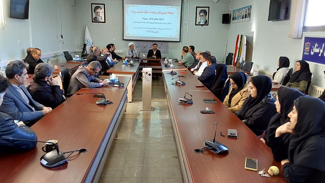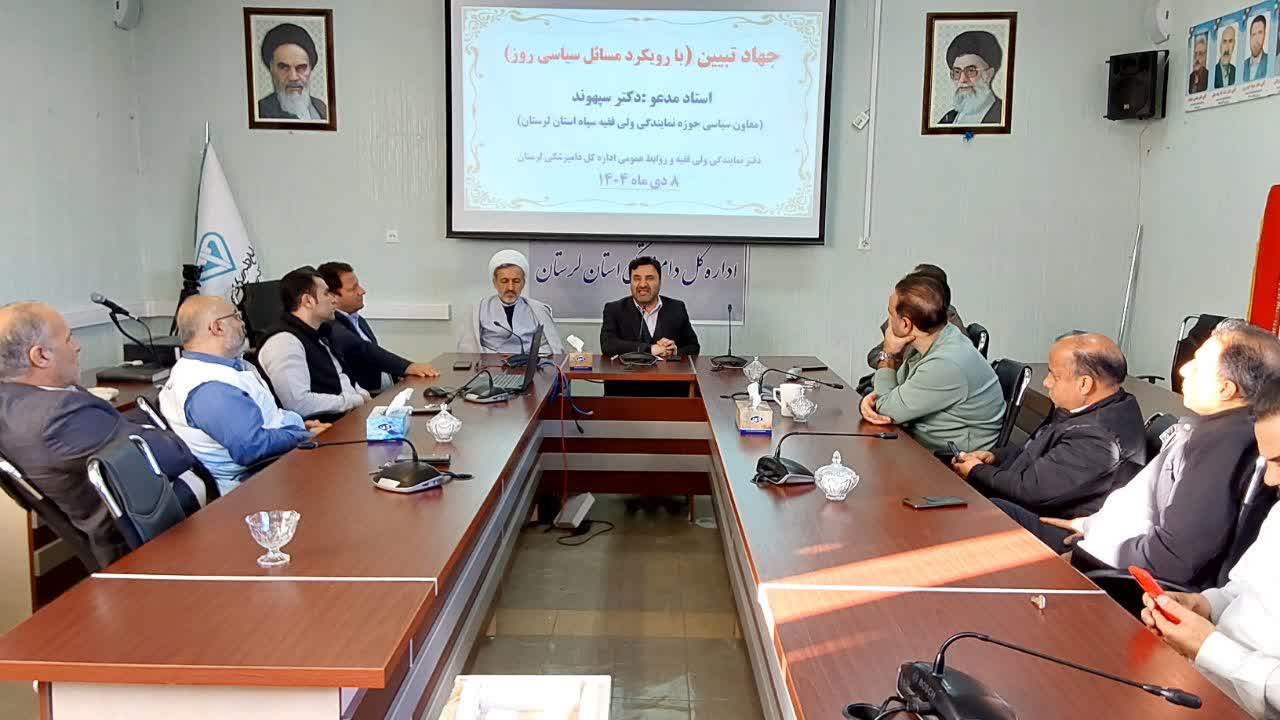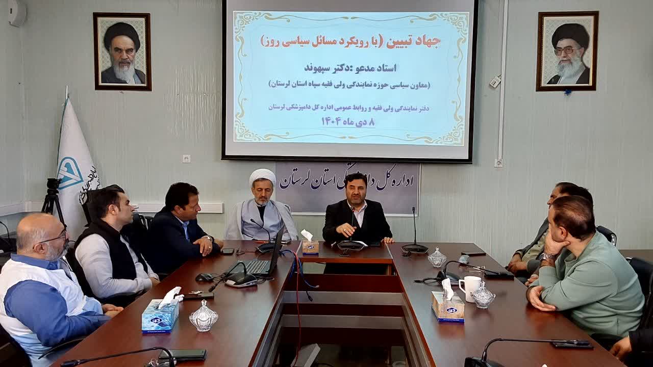 نشست جهاد تبیین با موضوع بررسی مسائل روز با حضور مدیرکل، دفتر نمایندگی ولی فقیه، معاونین، همه همکاران ستادی، دامپزشکی خرم آباد و مرکز تشخیص برگزار شده و طی آن دکتر سپهوند معاون سیاسی حوزه نمایندگی ولی فقیه در سپاه استان لرستان به عنوان استاد مدعو به ایراد سخنرانی پرداخت.