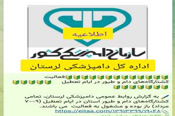 به گزارش روابط عمومی اداره کل دامپزشکی لرستان، مدیر کل دامپزشکی استان لرستان از فعالیت کشتارگاه های طیور و دام استان در ایام تعطیل سخن به میان آورد.