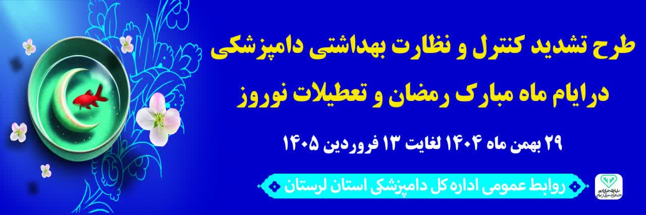 به گزارش روابط عمومی اداره کل دامپزشکی استان لرستان طرح تشدید نظارت‌های بهداشتی دامپزشکی ویژه ماه مبارک رمضان و ایام پایانی سال از ابتدای اسفند ماه تا پایان ۱۵ فروردین در لرستان شروع شد.